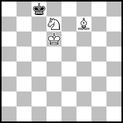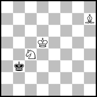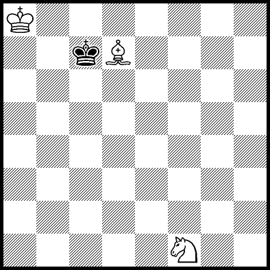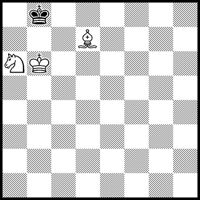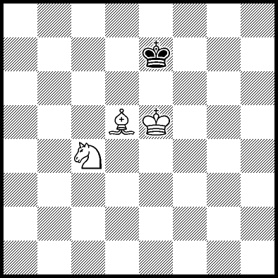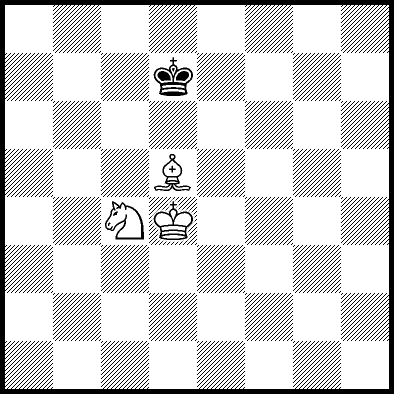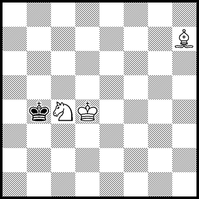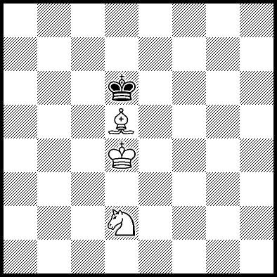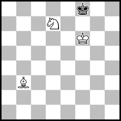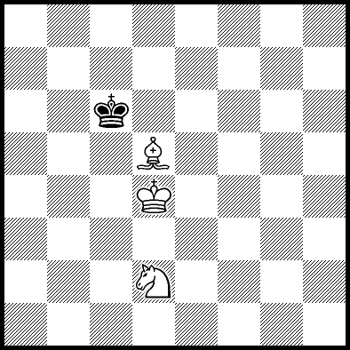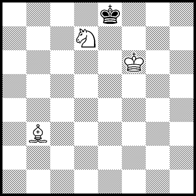 | Mate in 26 with Kd6. Worse are Kc6 with mate in 27, Be6, Bf7, Kc7, Ke7, Na3, Na5, Nd2 and Nd6 with mate in 28, Kc8, Kd8, Ke8, Nb2 and Nb6 with mate in 29, and Bd5, Bh7, Ke6, Ne3 and Ne5 which throw away the win. |
