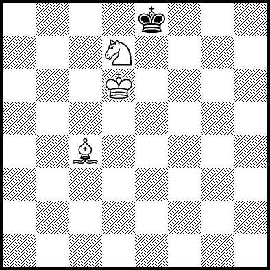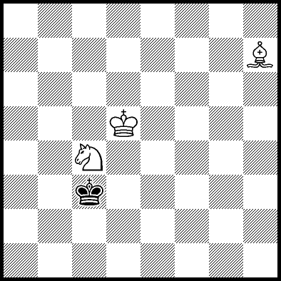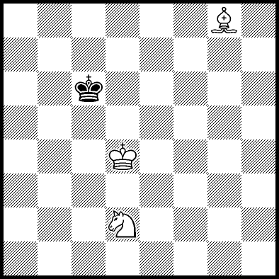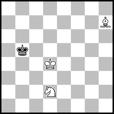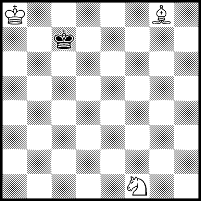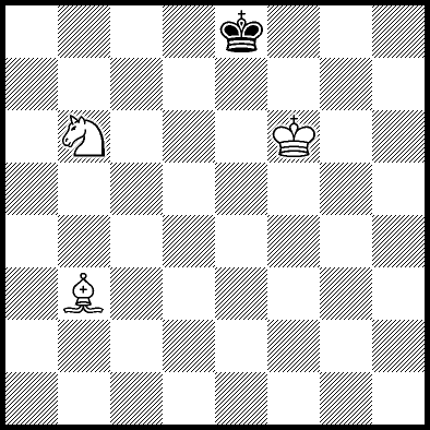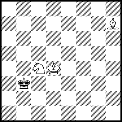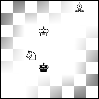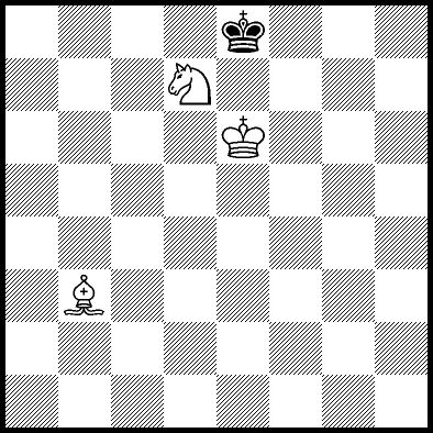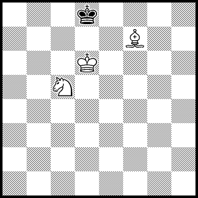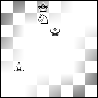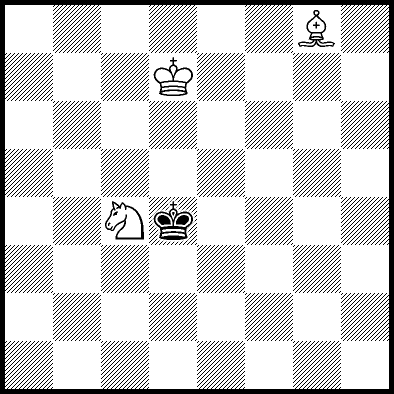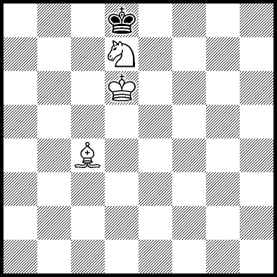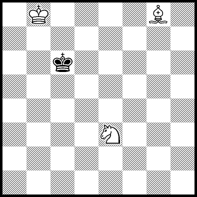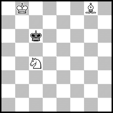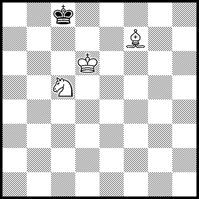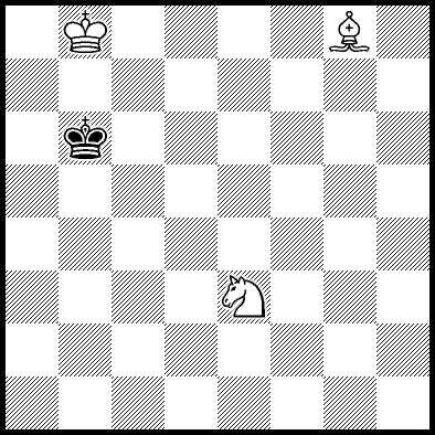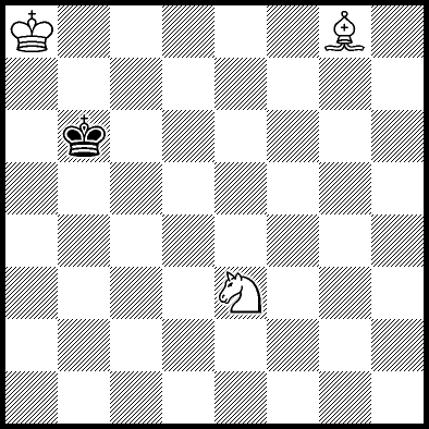 | Mate in 18 with Ke5. Worse are Ke4 with mate in 19, Na3, Na5, Nb2, Nb6+, Nd2 and Ne3 with mate in 20, Ne5+ with mate in 25, Bf7, Bg8, Kc3, Kc5, Kd3 and Ke3 with mate in 26, Ba8, Bb7, Be4, Bf3, Bg2 and Bh1 with mate in 27, and Bc6+, Be6+ and Nd6 which throw away the win. |