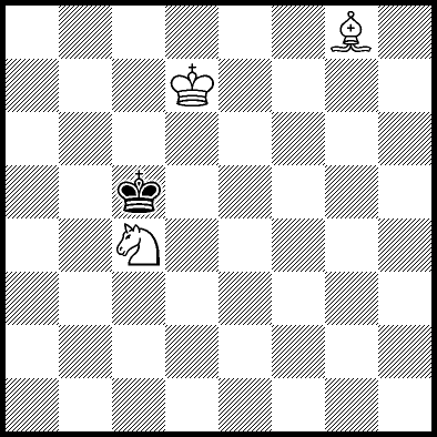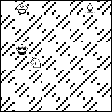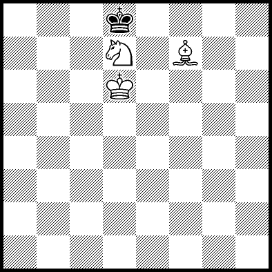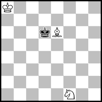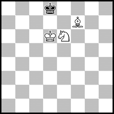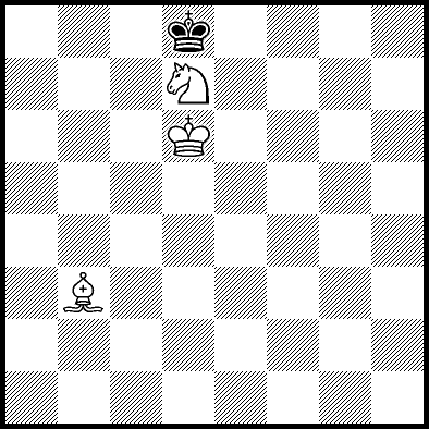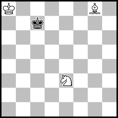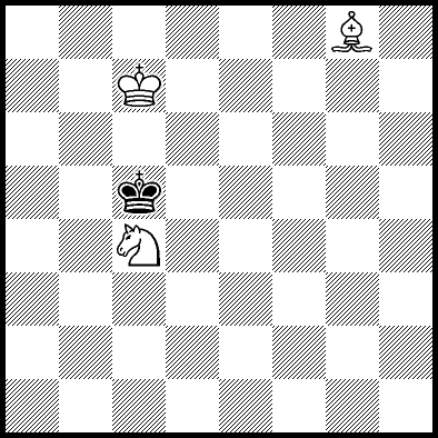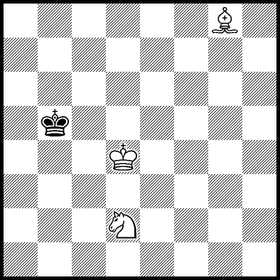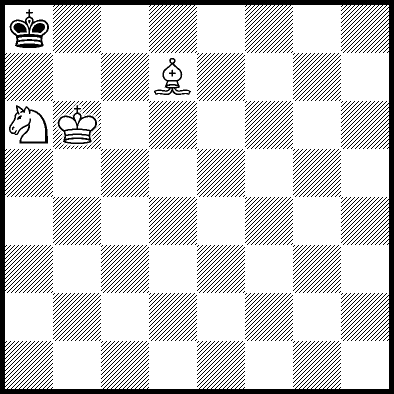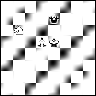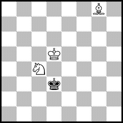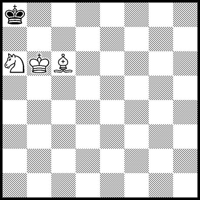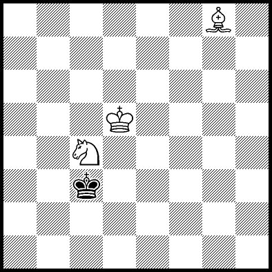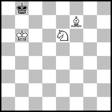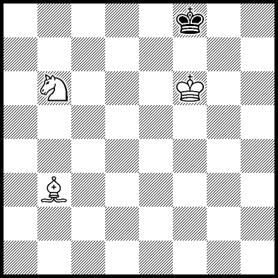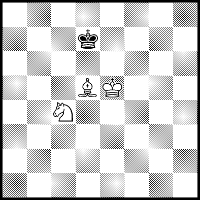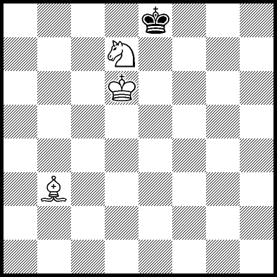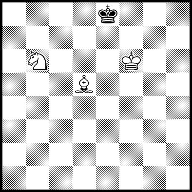| Mate in 18 with Ke5. Worse are Ke4 with mate in 19, Na3, Na5, Nb2, Nb6+, Nd2 and Ne3 with mate in 20, Ne5+ with mate in 25, Bf7, Bg8, Kc3, Kc5, Kd3 and Ke3 with mate in 26, Ba8, Bb7, Be4, Bf3, Bg2 and Bh1 with mate in 27, and Bc6+, Be6+ and Nd6 which throw away the win. |