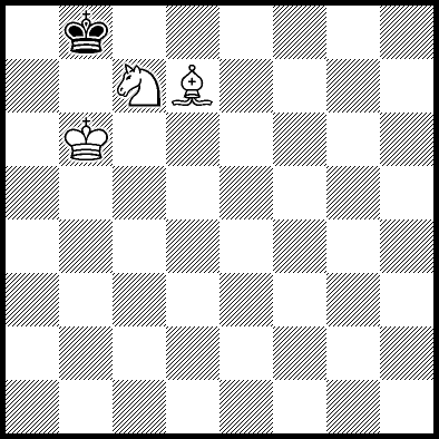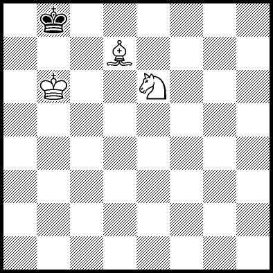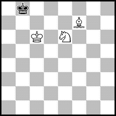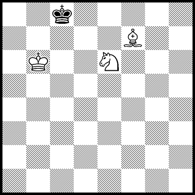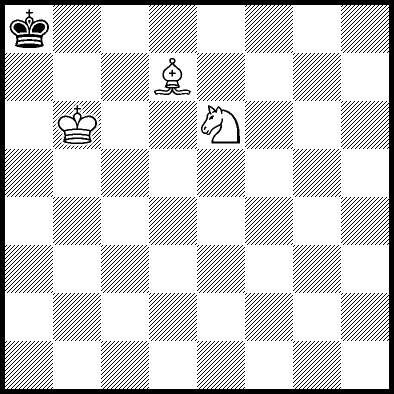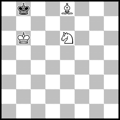 | Mate in 8 with Nb7+ and Ne6+. Worse are Bg6 and Bh5 with mate in 9, Na4, Na6, Nb3, Nd3, Nd7 and Ne4 with mate in 10, Ba2, Bb3, Bc4, Bd5, Be6 and Bg8 with mate in 12, Ke6 with mate in 14, Ke5 with mate in 18, Kd5 with mate in 27, Kc6 with mate in 28, and Be8 which throws away the win. |