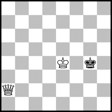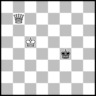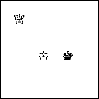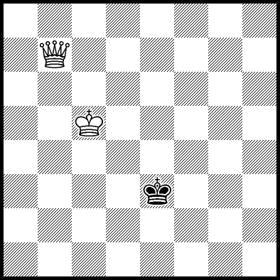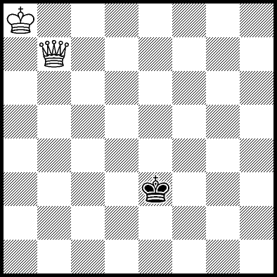 | Mate in 6 with Qa6, Qb6, Qc6, Qe7 and Qf7+. Worse are Kd5, Ke3, Qa8, Qb1+, Qb2, Qb3, Qb4, Qb5+, Qb8, Qc7, Qc8+, Qd5+, Qd7+, Qe4+, Qf3+, Qg2, Qg7, Qh1 and Qh7+ with mate in 7, and Kc3, Kc4, Kc5, Kd3 and Qa7 with mate in 8. |