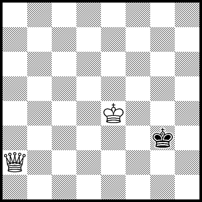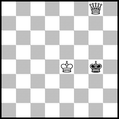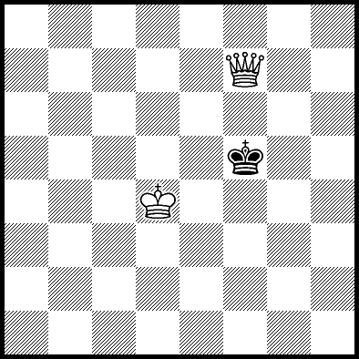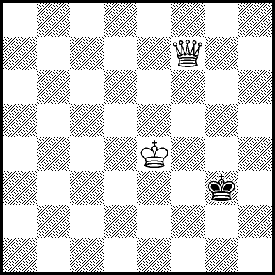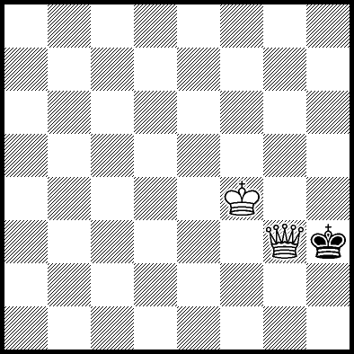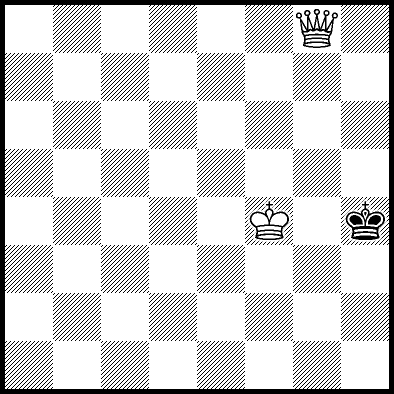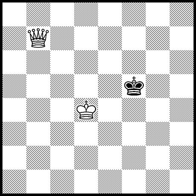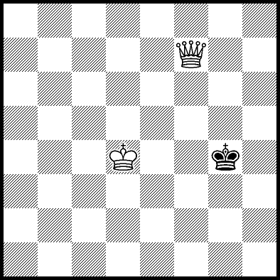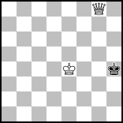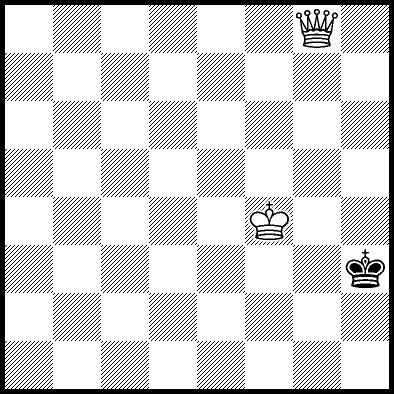 | Mate in 3 with Qg2+ and Qg8+. Worse are Qa1 and Qa7 with mate in 4, Qa3, Qa4, Qa5, Qa6, Qa8, Qb1, Qb2, Qb3, Qc2, Qc4, Qd2, Qd5, Qe2+, Qe6+, Qf2, Qf7 and Qh2 with mate in 5, Ke5 with mate in 6, Kd4, Kd5 and Ke3 with mate in 7, and Kd3 with mate in 8. |