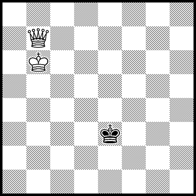 | Mate in 8 with Kc5, Kc6, Qd5, Qd7, Qe7+, Qf7, Qg2, Qh1 and Qh7. Worse are Kb5, Kc7, Qa6, Qa7, Qa8, Qb8, Qc6, Qc7, Qc8 and Qg7 with mate in 9, Ka5, Ka6 and Ka7 with mate in 10, and Qe4+ and Qf3+ which throw away the win. |