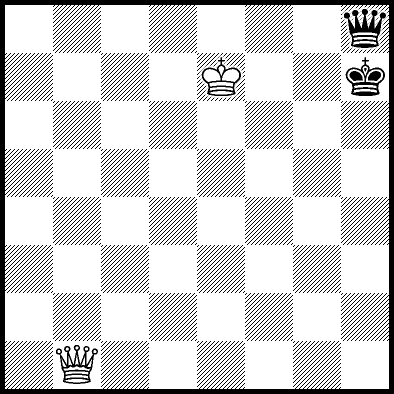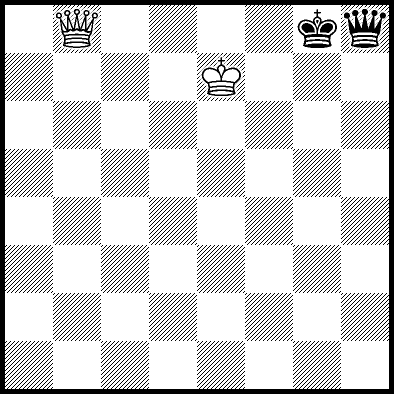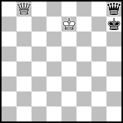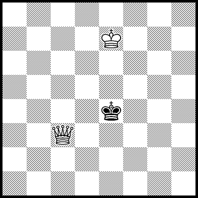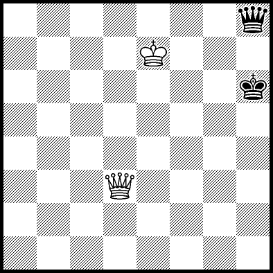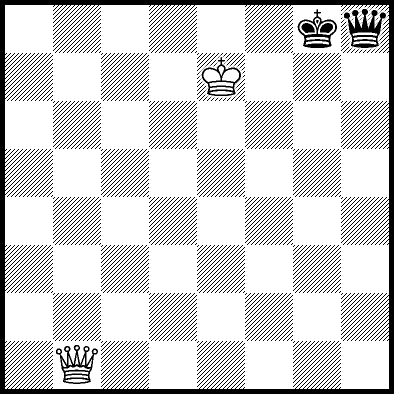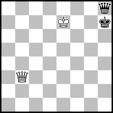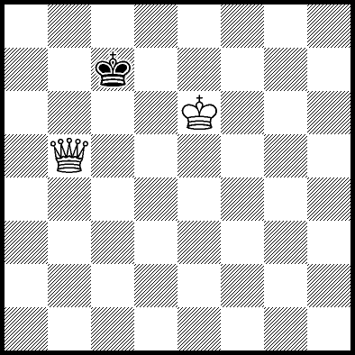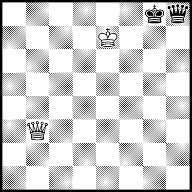 | Mate in 6 with Ke6 and Kf6. Worse are Kd6, Kd7, Ke8, Kf7 and Qd2 with mate in 7, Kd8, Kf8, Qa1, Qa3, Qa5, Qb2, Qb3, Qb4+, Qc1, Qc2+, Qc4+, Qc5, Qc6+, Qe1+, Qf6, Qg3 and Qh3 with mate in 8, Qc7, Qc8, Qg7 and Qh8 with mate in 9, and Qd3+, Qd4+, Qe3+, Qe5+ and Qf3+ which throw away the win. |