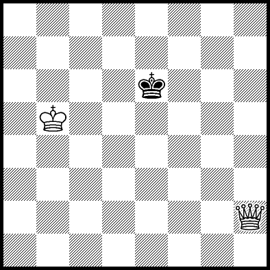 | Mate in 29 with Ke2. Worse are Qa2+, Qa6, Qa7, Qa8+, Qb4, Qb5+, Qd7+ and Qe8 with mate in 30, Ke1, Qa1, Qa5+, Qc2, Qf4, Qg4 and Qh4 with mate in 31, Kf1, Kg1 and Kg2 with mate in 32, and Qa3, Qb3+, Qc4+, Qc6+, Qd1, Qd4+ and Qe4+ which throw away the win. |