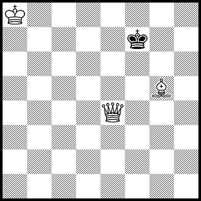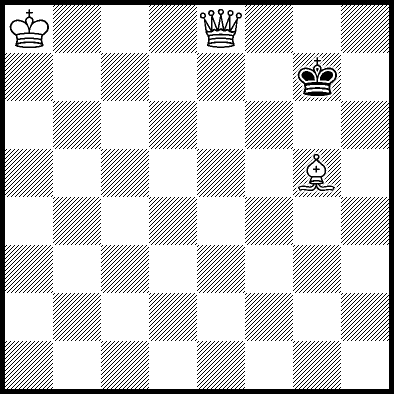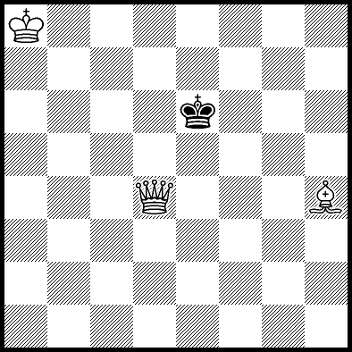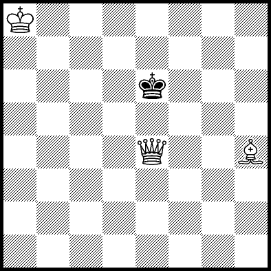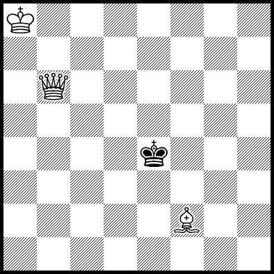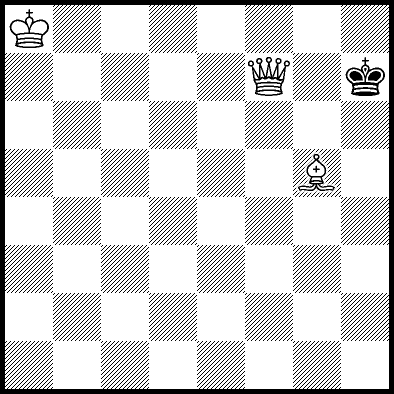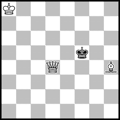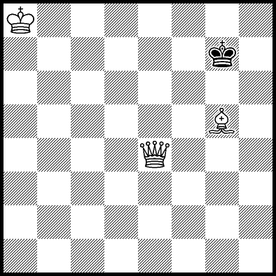 | Mate in 5 with Qe4+. Worse are Kb7, Qc5, Qf4 and Qg4+ with mate in 6, Bd8, Be1, Bf2, Bf6, Bg3, Bg5, Ka7, Kb8, Qa4, Qb2, Qb4, Qc3, Qc4+, Qd1, Qd2, Qd3, Qd8, Qe3+, Qf2, Qf6+, Qg1 and Qg7 with mate in 7, Be7, Qa1, Qa7, Qb6+ and Qh8 with mate in 8, and Qd5+, Qd6+, Qd7+ and Qe5+ which throw away the win. |